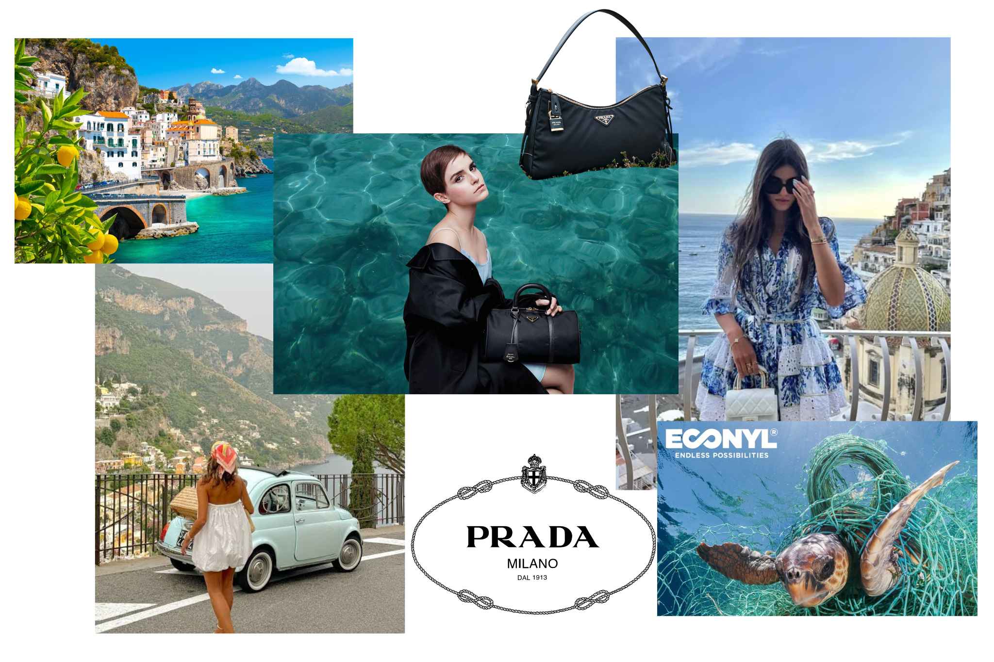 A summer beach collection crafted from Prada Re-Nylon, made using ECONYL regenerated from discarded fishing nets and ocean waste.