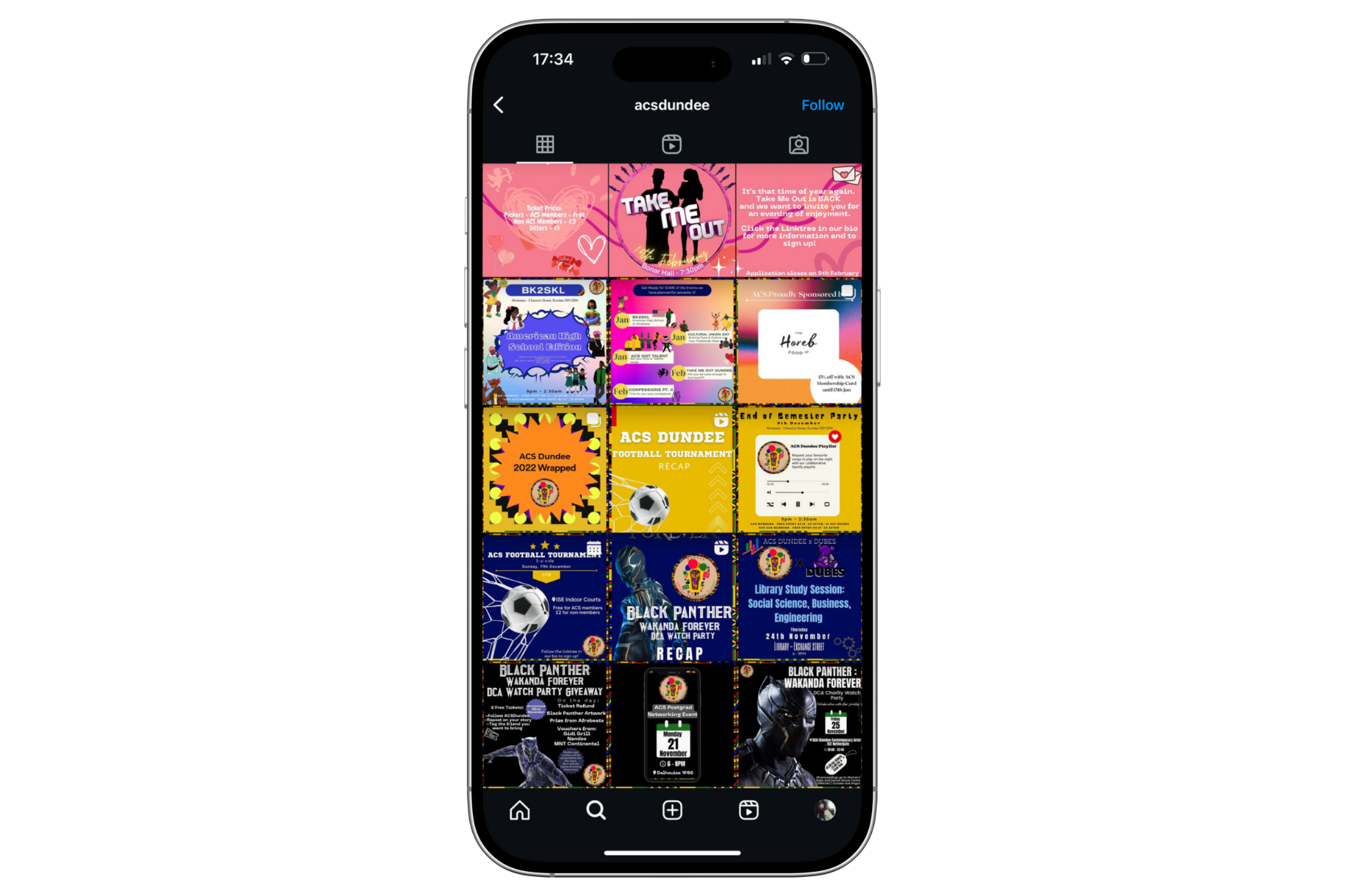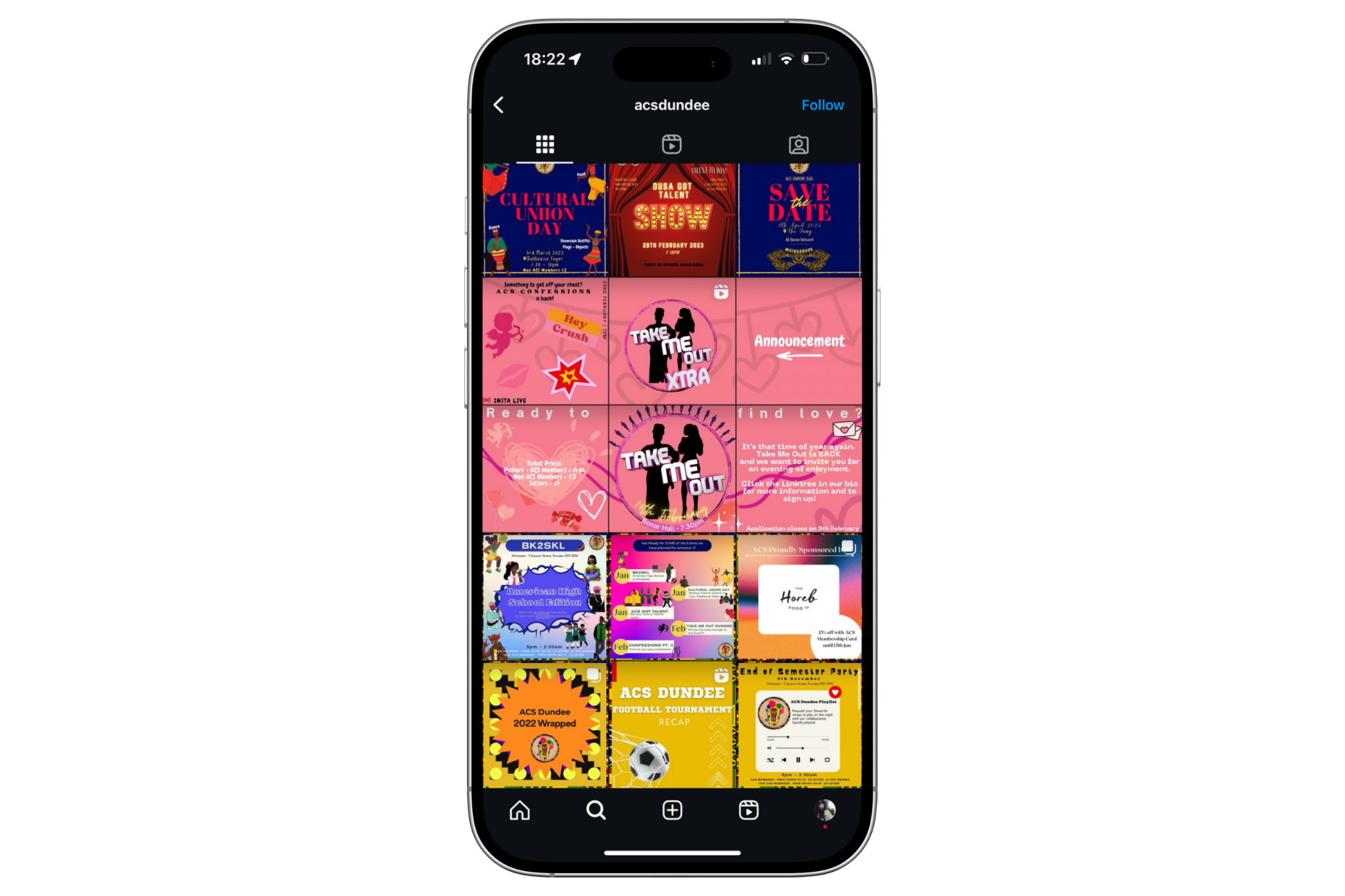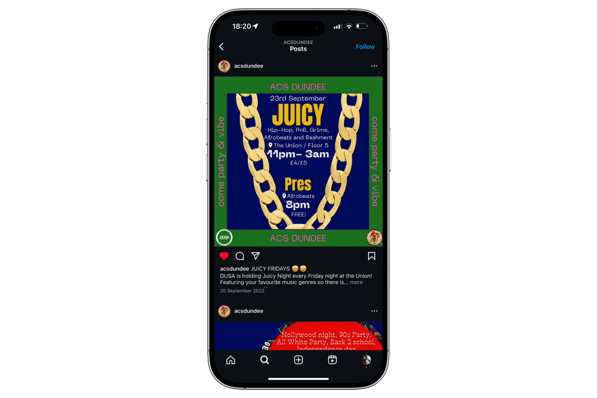 I led social media and campaign promotion for the African Caribbean Society at Dundee University, managing the society’s digital presence and marketing activity across events, collaborations and on-campus initiatives. Over a seven-month period, I focused on growing audience engagement, strengthening brand identity, and driving attendance through platform-native content and campaign-led promotion.